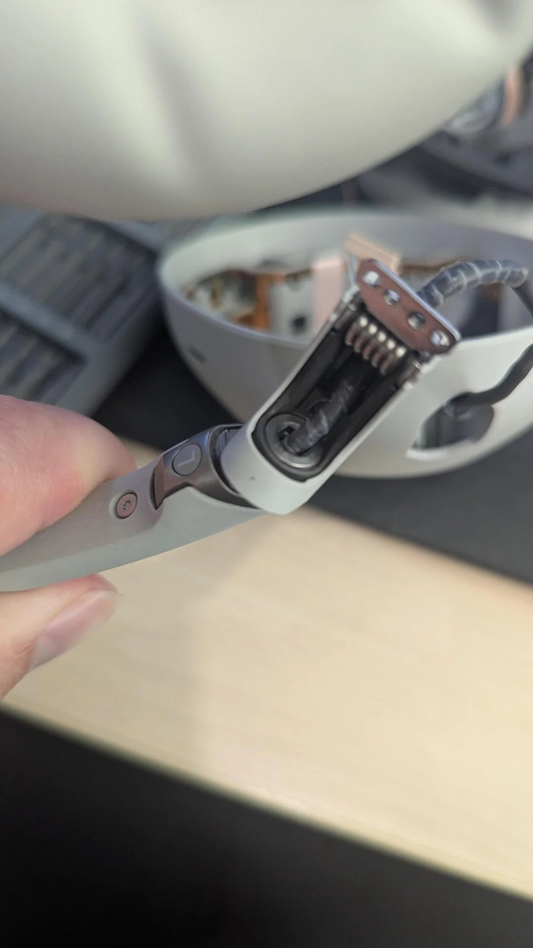 As you can see in the photos from the post above, the XM6’s hinge utilizes a threaded nut mechanism with an O-ring, allowing the joint to rotate freely. In this pair of broken headphones, this nut had simply become loose—not cracked, not visibly damaged, just insufficiently tightened. Once the user properly tightened it, the hinge worked perfectly and felt as strong as the intact side.